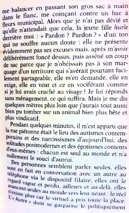 Bon ! A présent qui sont ces gens que je ne supporte plus, passons à l' objet principal de mon ras le bol envers cette société du zapping qui, en réalité, n' en a rien à faire de rien ou de presque rien, plus préoccupés ces gens de leur petite personne que des autres gens qui les entourent. Désolée de ne pas trouver normal d' être plantée sur un trottoir lors d' une conversation avec un copain, voisin de quartier, ou encore un quidam qui s' empresse de sauter sur son portable pour continuer la conversation avec ....celui ou celle qui l' appelle de loin. Et cela sans s' excuser. Pas le temps, l' urgent étant de passer illico presto à autre chose ! Ou à une autre personne qui vient en sens inverse sur le même trottoir, comme hier matin.