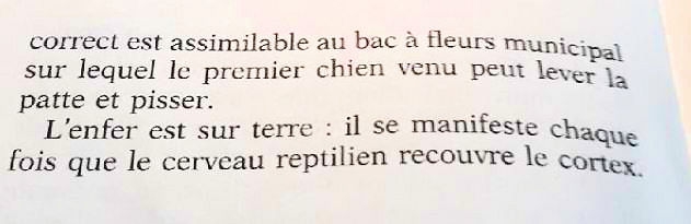Enfin, bref ! Se reporter au livre de Michel ONFRAY qui vient d' écrire LA NEF des FOUS vous y lirez des passages savoureux et plein d' humour sur la société actuelle et le délitement de cette dernière ! Il y a peu j' en avais encore de l' humour, noir bien souvent, déja sérieusement entaché, désespéré, mais là j' ai beau creuser je n' y arrive plus, je viens de tomber au fond du trou !
